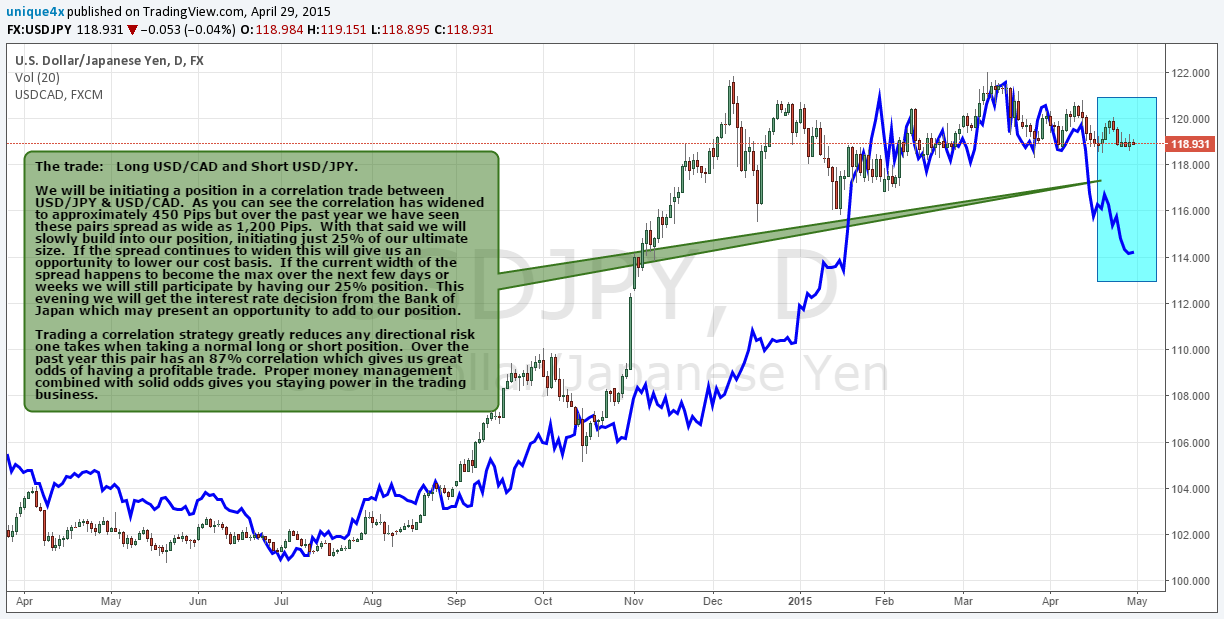 *Position Update: At 04/29/2015 @ 23:07 EST The Global Currency Scalper liquidated 75% of the correlation trade between USD/JPY & USD/CAD. The USD/CAD long was closed at 1.20260 picking up 12.6 Pips and the USD/JPY short was closed at 118.733 for a profit of 20.7 Pips giving us a total of 33.3 (24.9) Pips of profit. We will hold 25% of our position while the correlation narrows over time.